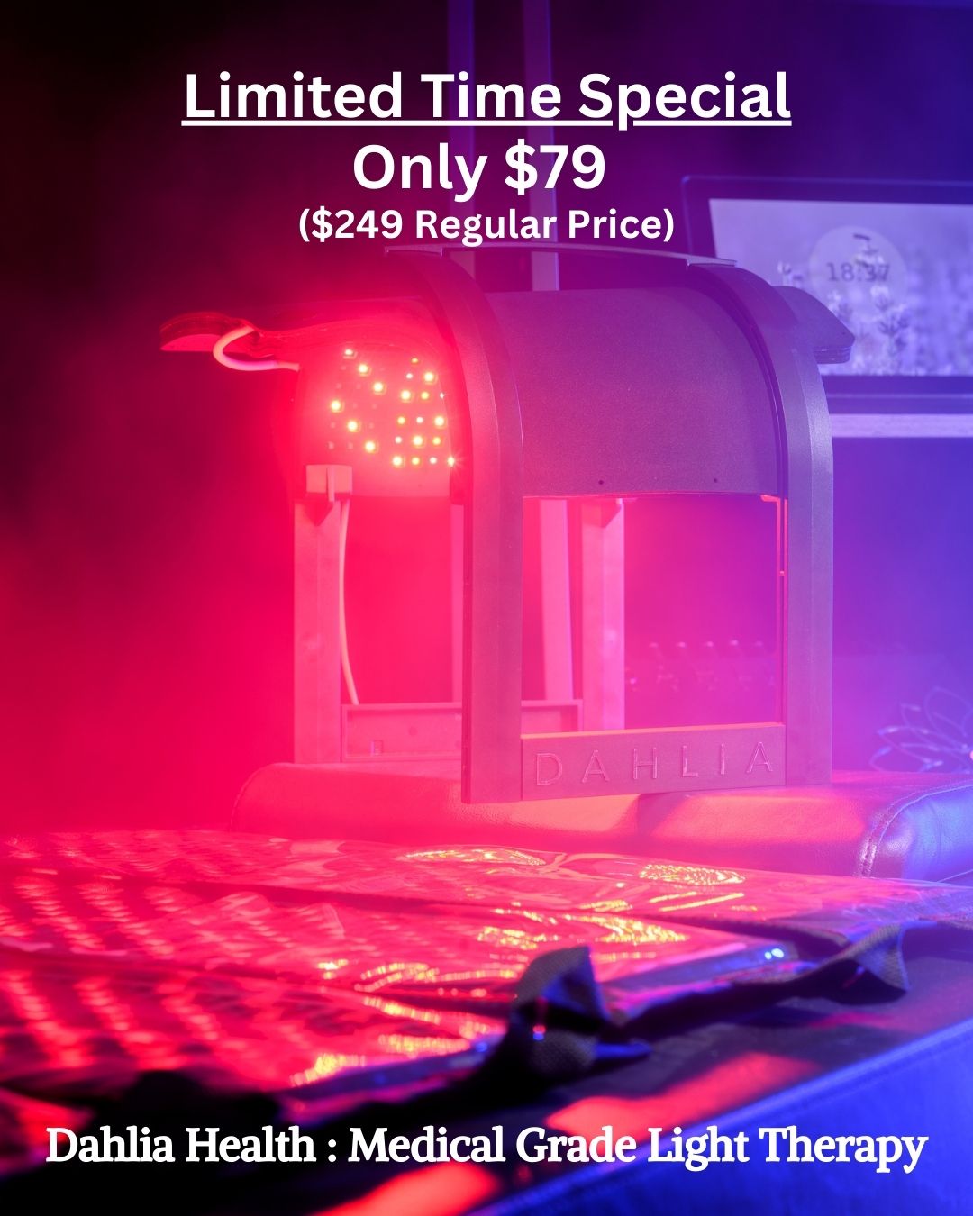 Dahlia also uses a different wavelength in the Face Pad which can help with visual acuity, blemishes, wrinkles, tightening of the face, and more.